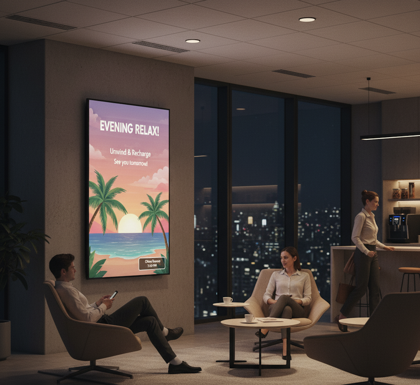 Break area digital signage switches to relaxing entertainment content or end-of-day reminders.