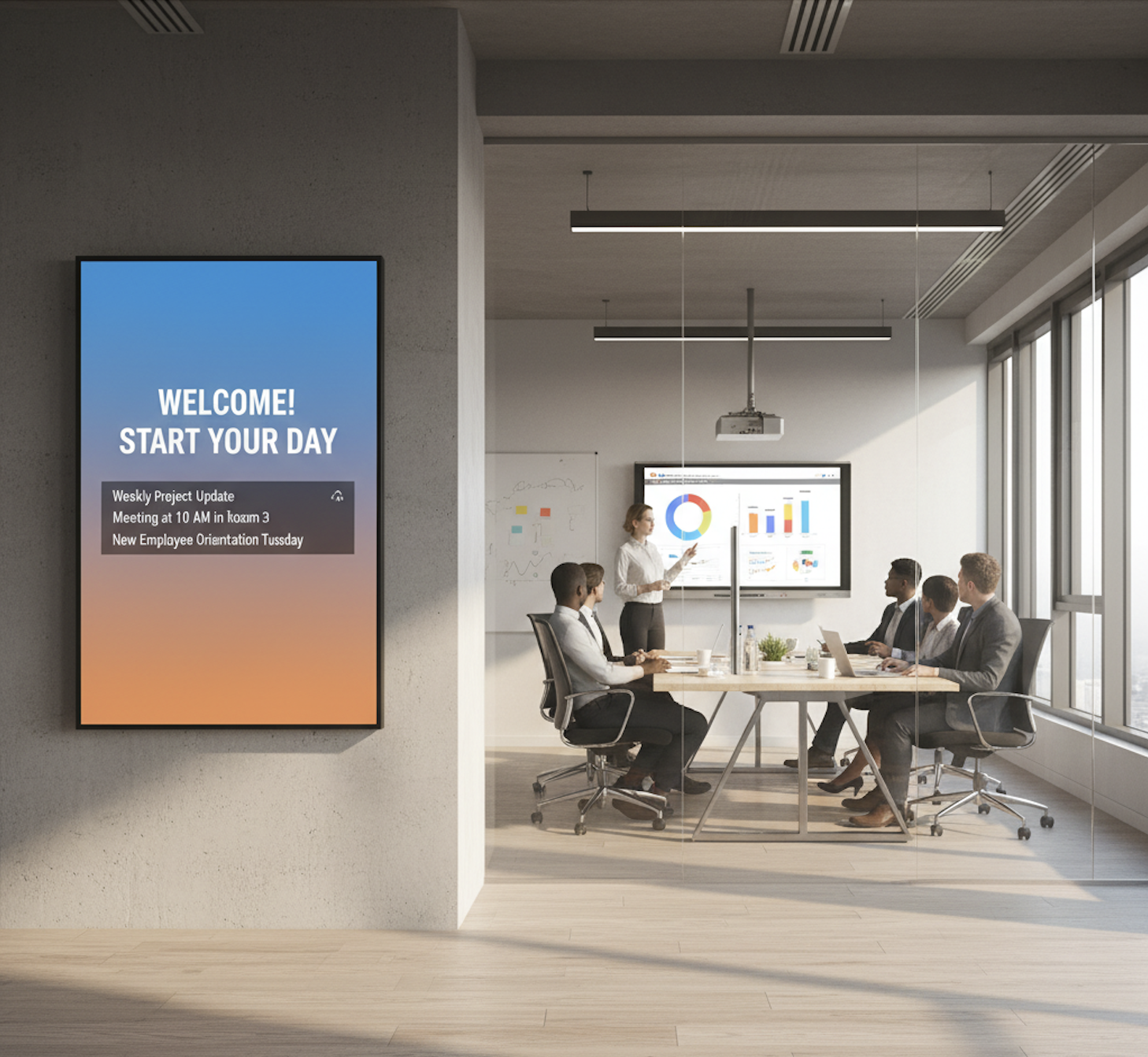 Office entrance digital signage displays welcome messages and company announcements. Conference rooms use projectors and interactive whiteboards for morning meetings.