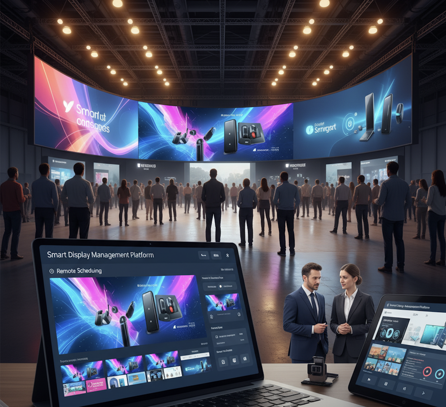 The exhibition hall's LED screen showcases new product videos, attracting visitors. Managers monitor all screen content in real-time via the innovative management platform.