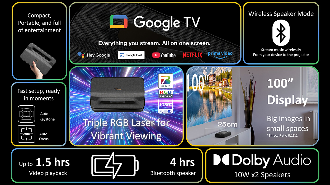 Leverage Google’s intelligent technology to effortlessly enjoy all your favorite entertainment. Featuring an integrated battery and advanced RGB three-color laser technology, this compact yet powerful projector delivers 1,200 HK lumens of portable big-screen viewing.